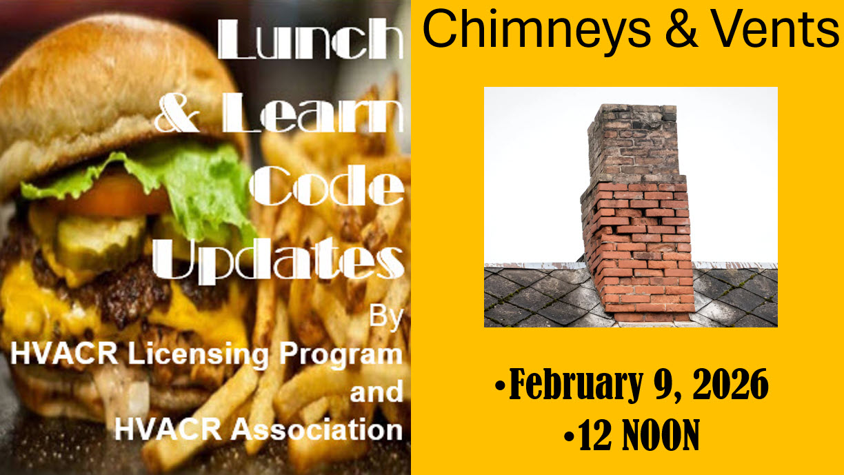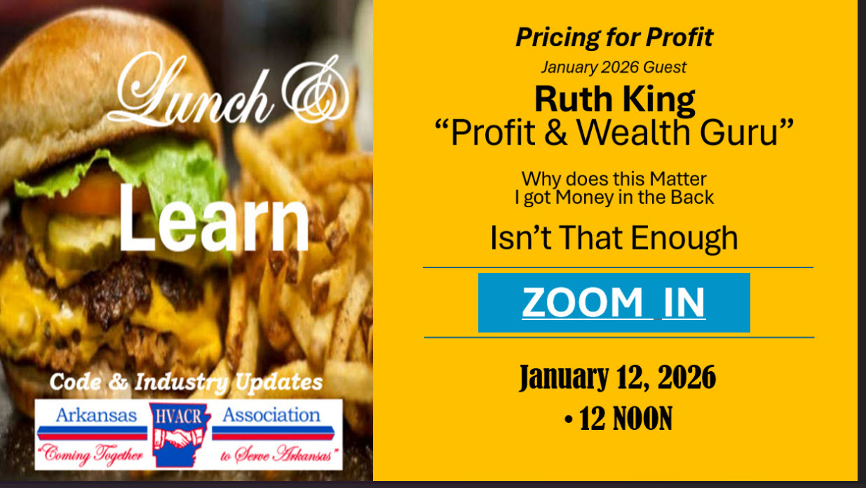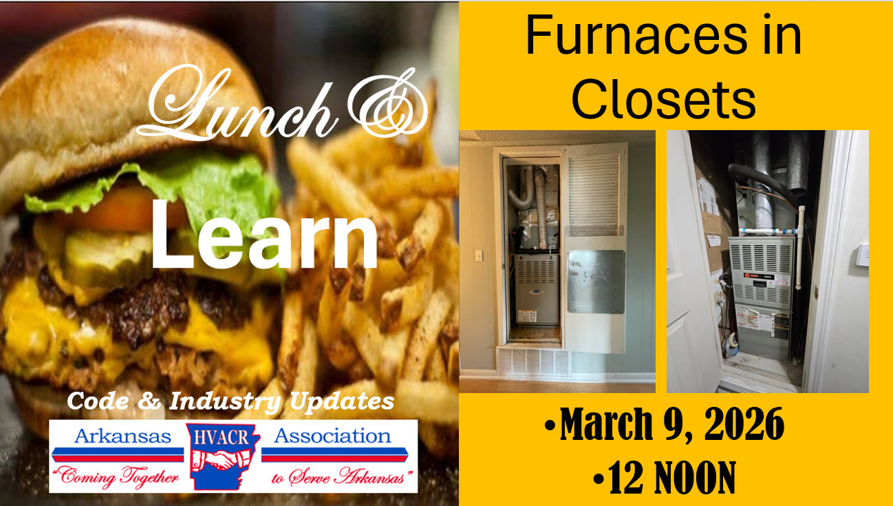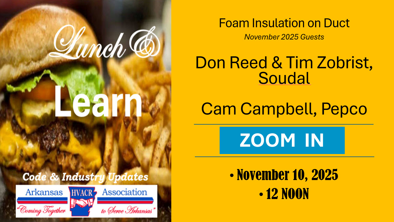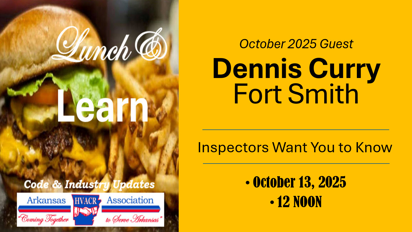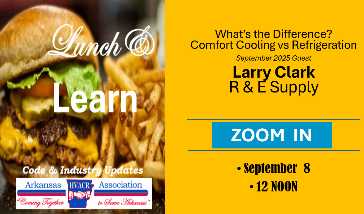 The first of its kind and may still be the only one. Lunch & Learn webinars are free to everyone on the 2nd Monday of each month at noon. They are a collaboration between the Arkansas Department of Labor and Licensing, HVACR Program and the Arkansas HVACR Association. The goal is to provide code updates and clarification for the HVACR industry. Since education is the cheapest and most effective form of regulation and inspection, we trust that these short, about 20 minute, sessions will prove valuable to the industry and ensure Arkansans safe, effective HVACR systems. So grab a burger and tune in. You’ll be glad you did. Archives follow. Just click on the graphic.